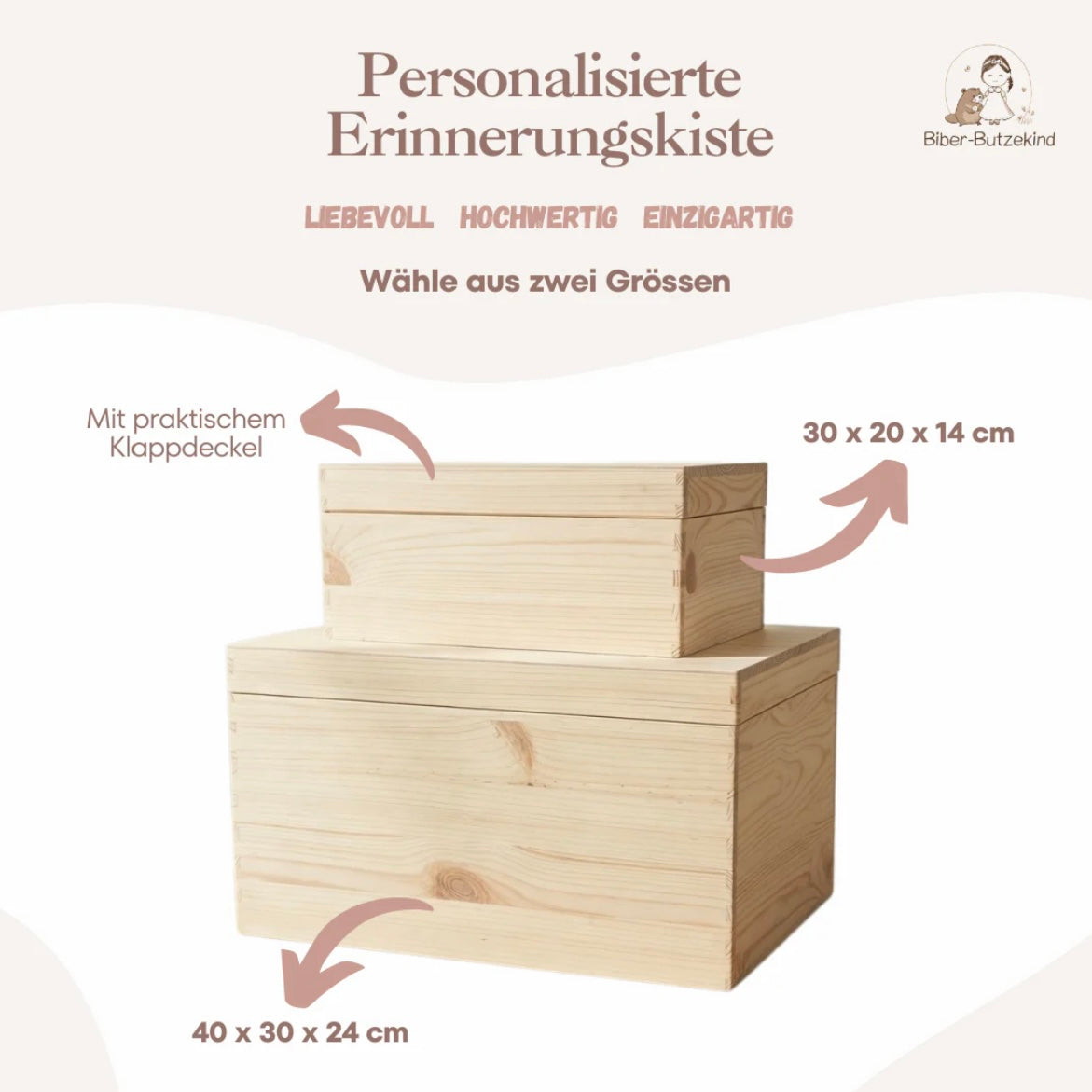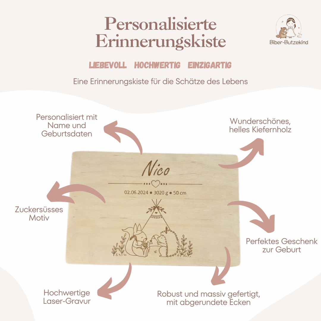 Wir bieten auch Nuggiketten an, die nicht nur praktisch sind, sondern auch mit dem Namen des Babys personalisiert werden können. Unsere Erinnerungskisten sind liebevoll graviert oder bedruckt und bieten einen besonderen Platz für die ersten Schätze deines Kindes. Diese Kisten sind ebenfalls personalisiert verfügbar.