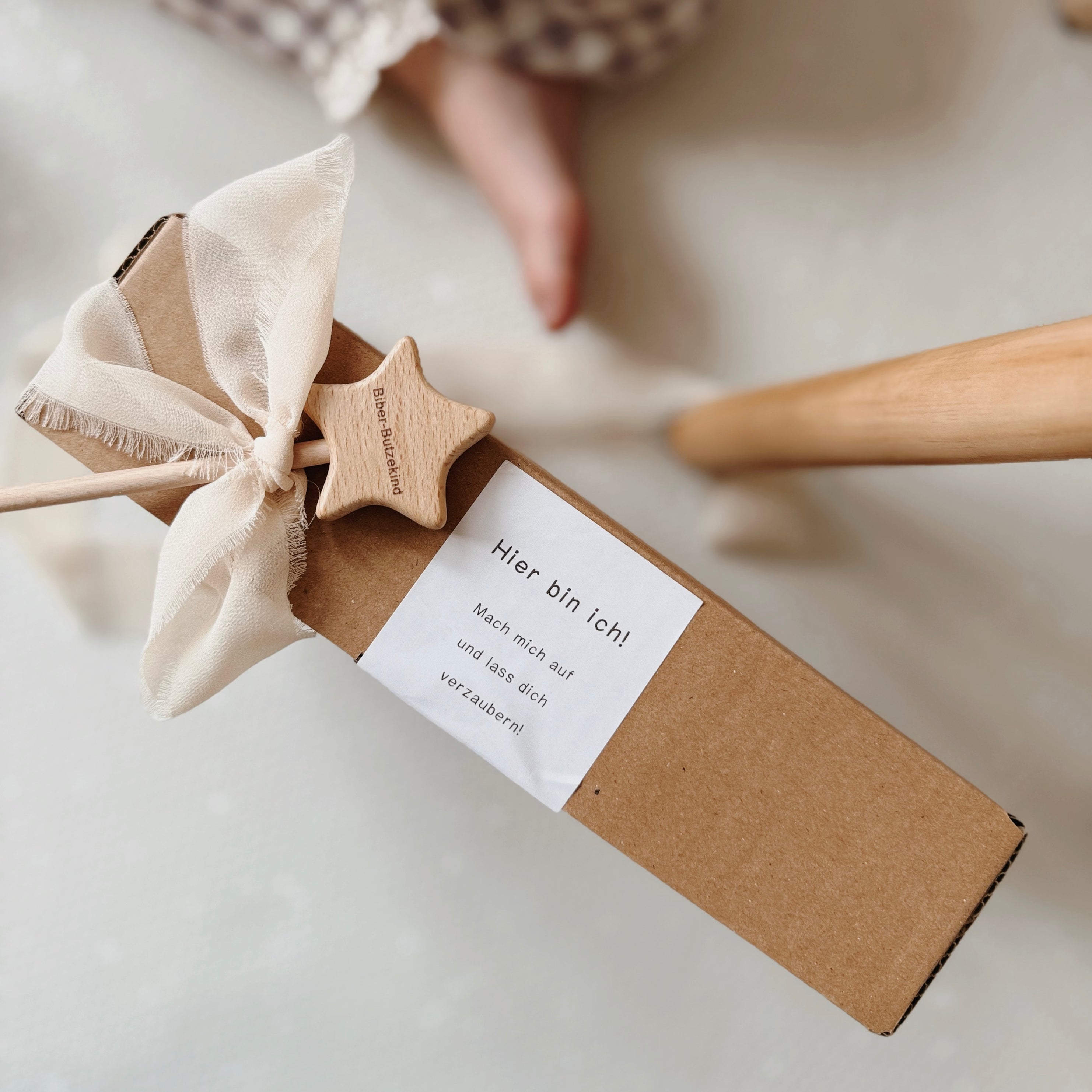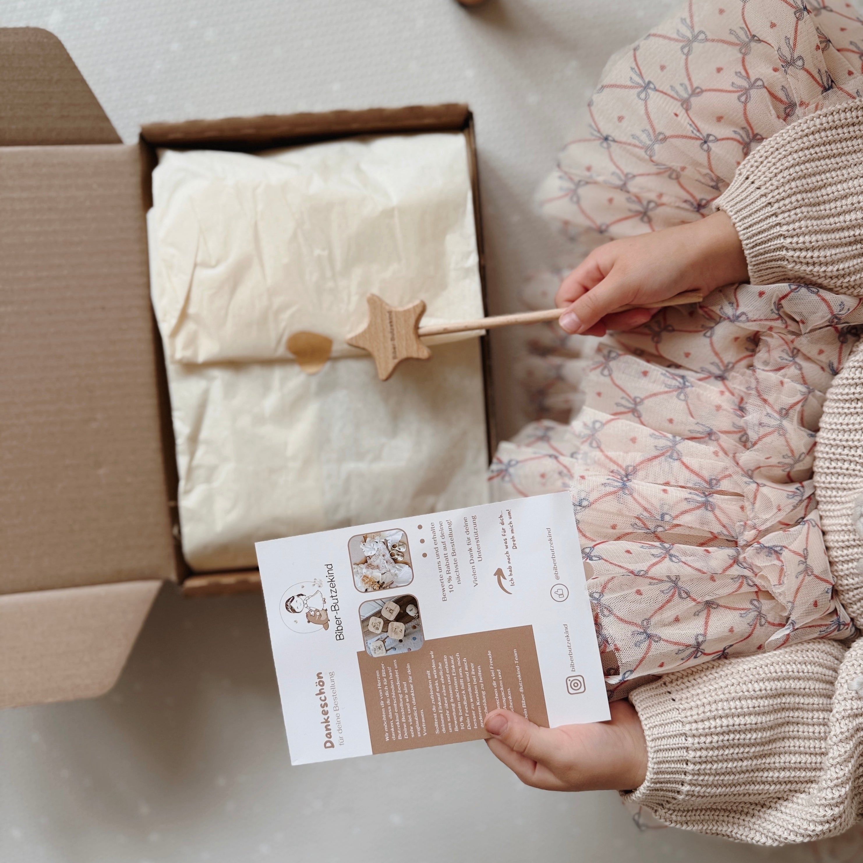 Liebevoll in Seidenpapier verpackt, erwartet dich eine kleine Überraschung. Jedes Kind erhält zudem einen Holzstauberstarb, einen Glücksbringer, der Wünsche erfüllt und beschützt.