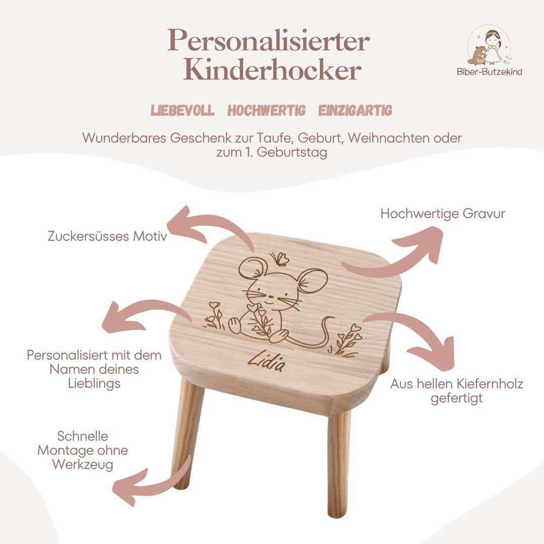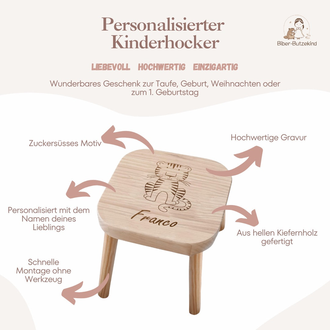 Ein personalisierter Kinderhocker ist ein praktisches und individuelles Möbelstück für Kinder. Er wird aus hochwertigem Holz gefertigt und kann mit Namen, besonderen Daten oder einer Botschaft graviert werden. Perfekt als Geschenk oder für den täglichen Gebrauch.
